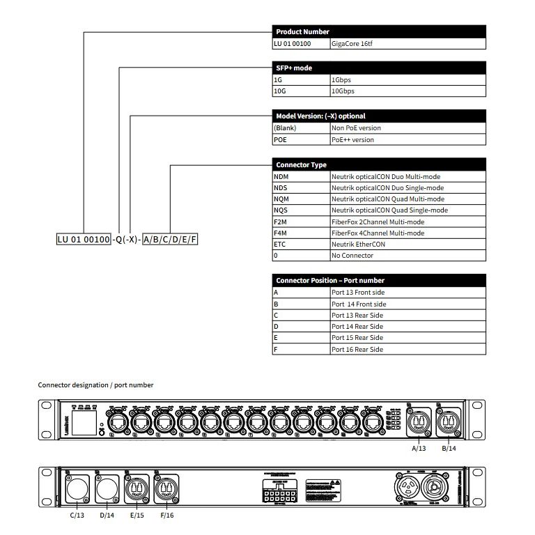 The GigaCore 16tf is an up to 10 Gigabit Ethernet switch for professional touring applications in lighting, audio and videoand provides ruggedised connectivity at the front as well as at the rear of the rack to accomodate multiple edge devices in a flexible way with several fiber and copper connector options from factory.