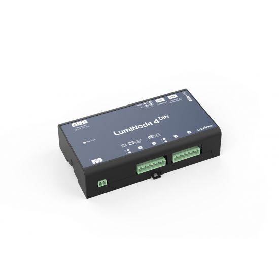 The unit can be powered over PoE or DC voltage. The second 1Gb RJ45 Ethernet port can be used to connect any other application or the next LumiNode 4 DIN (DC powered).