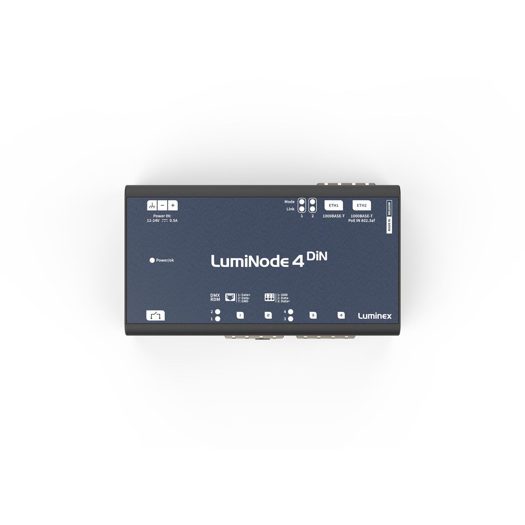 LumiNode 4 DIN is specifically designed for fixed installations to fit on a standard DIN rail. The compact design and standardised mounting bracket is ideal for Architainment applications and install projects. For full flexibility the unit comes either with DMX/RDM RJ45 connectors or Terminal Blocks.